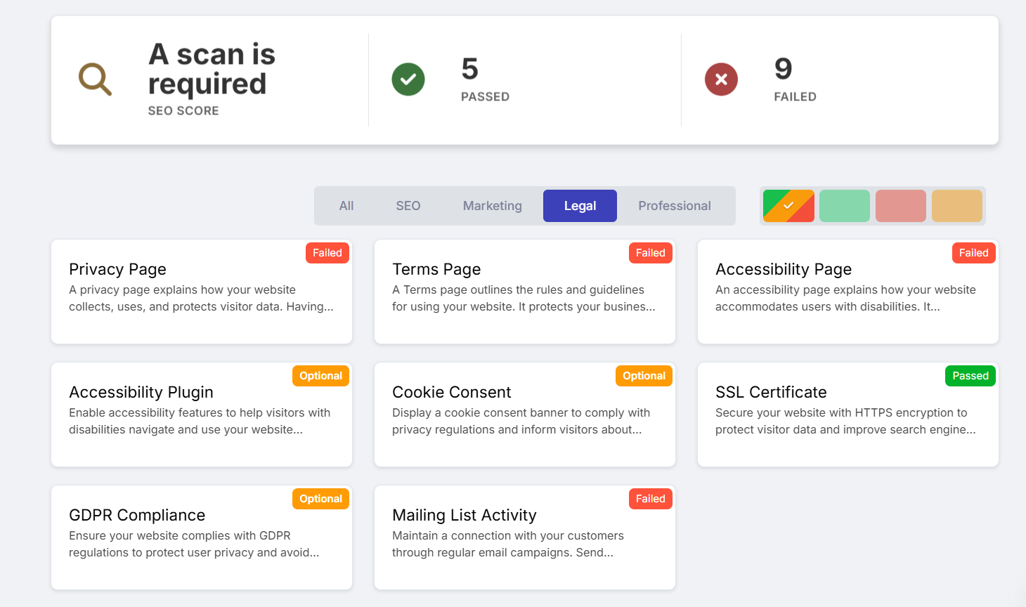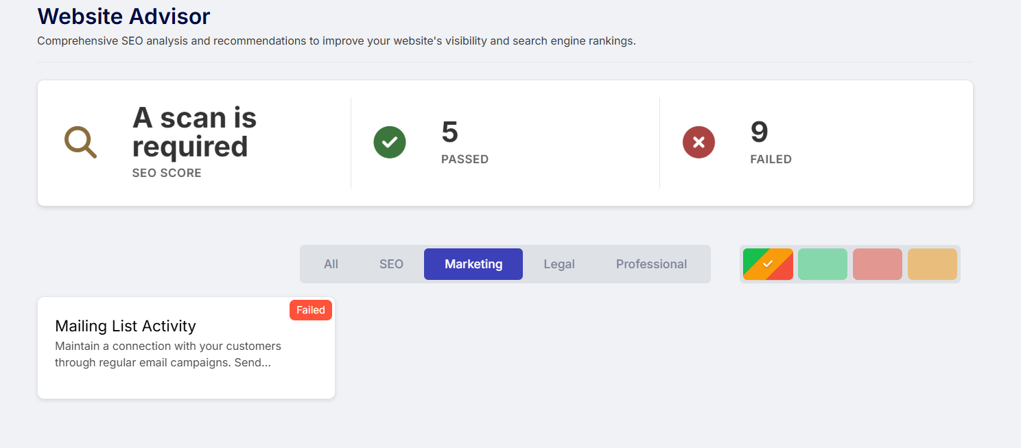 O Advisor fornece orientações sobre se o seu site atende aos requisitos do GDPR e quais etapas ainda podem ser necessárias.